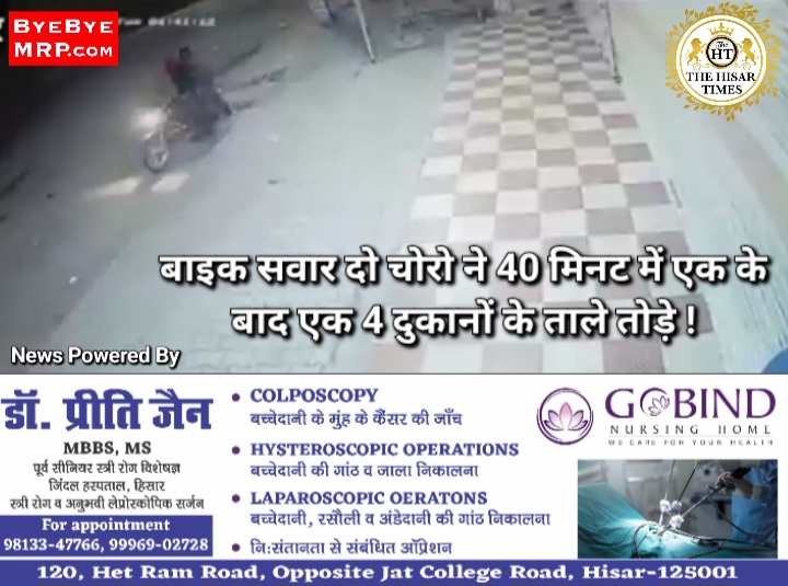 हिसार टाइम्स – आजाद नगर क्षेत्र में रविवार अलसुबह बाइक सवार दो युवकों ने 40 मिनट में एक के बाद एक चार दुकानों के ताले तोड़ डाले। आजाद नगर की गली नंबर एक स्थित किराना की दुकान में करीब चार बजे चोरों ने वारदात को अंजाम दिया। चोर काले रंग की बाइक पर आए थे। … Continue reading बाइक सवार दो चोरो ने 40 मिनट में एक के बाद एक 4 दुकानों के ताले तोड़े !