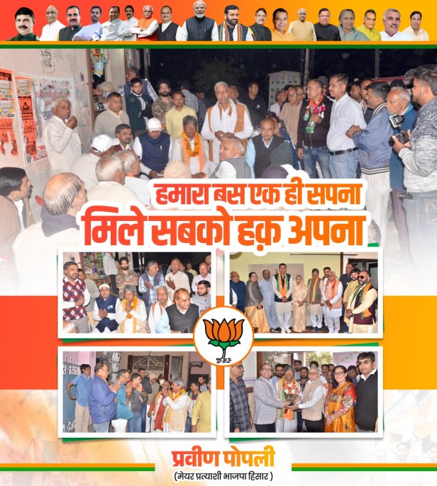हिसार टाइम्स -भाजपा के मेयर पद के प्रत्याशी प्रवीण पोपली ने कहा कि हिसार की जनता खुद भाजपा प्रत्याशियों के लिए प्रचार में लगी हुई है, हिसार के हर वार्ड से भाजपा के पार्षद प्रत्याशियों को हिसार की जनता से पूरा प्यार मिल रहा है उन्होंने कहा कि हमारा इलेक्शन हम नहीं लड़ते हमारा संगठन लड़ता है, संगठन जो भी रूपरेखा तैयार करेगा वही हम करेंगे, भाजपा प्रत्याशी ने कहा कि शहर के विकास में कोई कमी नहीं रहने दी जाएगी, ट्रिपल इंजन की सरकार में शहर का विकास तीन गुना स्पीड से करवाया जाएगा !