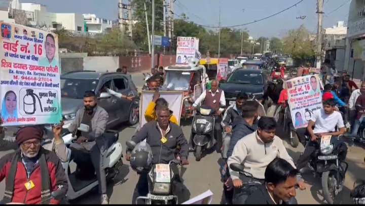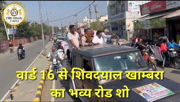 हिसार टाइम्स – हिसार मे निकाय चुनाव प्रचार के अंतिम दिन ,वार्ड नंबर 16 से आजाद पार्षद प्रत्याशी शिवदयाल खाम्बरा ने रोड शो में समर्थको के साथ अपनी ताकत दिखाई, ,रोड शो के दौरान सड़को पर झंडों से सजी गाड़ियों और दो पहिया वाहनों पर सवार समर्थकों ने चुनाव का माहौल अपने पक्ष में कर लिया,शहर में रोड पर जाम की स्थिति बन गई, वहीं वार्ड नंबर 16 से पार्षद पद प्रत्याशी शिवदयाल खाम्बरा रोड शो के दौरान ओपन गाड़ी में खड़े होकर लोगों का अभिवादन स्वीकार करते रहे , रोड शो में जीत के लिए नारे लगाते समर्थको का उत्साह देखते ही बनता था, शोर सुन कर लोग अपनी छतो पर व घरों से बाहर निकल आए और शिवदयाल खाम्बरा को जीत का आशीर्वाद दिया !