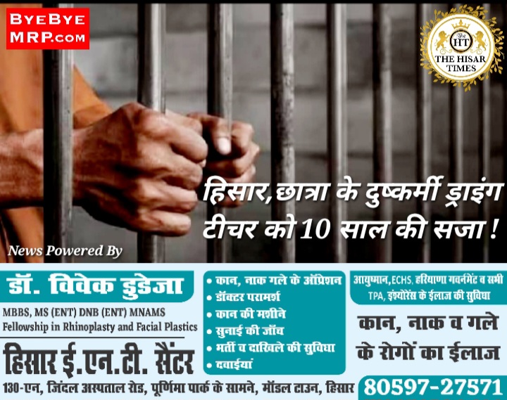 हिसार टाइम्स – हिसार में कोर्ट ने सरकारी स्कूल के ड्राइंग टीचर को 10 साल कैद की सजा सुनाई है। टीचर ने छात्रा को बंधक बना कर उसके साथ दुष्कर्म किया था। कोर्ट ने उस पर 36 हजार रुपए का जुर्माना भी लगाया है। मामले में सुनवाई अतिरिक्त जिला एवं सत्र न्यायाधीश सुनील जिंदल की कोर्ट में चल रही थी।जानकारी के अनुसार, सरकारी स्कूल में तैनात ड्राइंग टीचर राजबीर ने 2015 में नौवीं कक्षा की छात्रा को हवस का शिकार बनाया था। वह छात्रा को चॉकलेट और स्टेशनरी देकर फंसाता था।