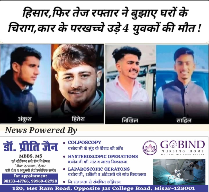 हिसार,फिर तेज रफ्तार ने बुझाए घरों के चिराग,कार के परखच्चे उड़े 4 युवकों की मौत !