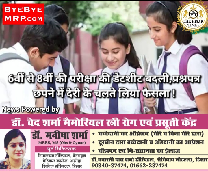 हिसार टाइम्स – हरियाणा में छठी से आठवीं कक्षा तक की परीक्षाओं की डेटशीट में बदलाव किया गया है। पहली परीक्षा को 15 दिन आगे बढ़ा दिया गया है। जिसके तहत 10 मार्च को होने वाली सभी परीक्षाएं अब 25 मार्च को होंगी।पेपर प्रकाशन में देरी और अन्य व्यवस्थाएं पूरी न होने के कारण यह फैसला लिया गया है। ताकि स्कूलों और शिक्षा विभाग को तैयारी के लिए अतिरिक्त समय मिल सके और परीक्षाएं बिना किसी बाधा के आयोजित की जा सकें।