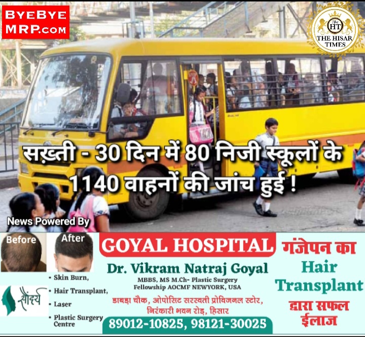 हिसार टाइम्स – हिसार जिले में 567 निजी स्कूल है, जिनके 2500 से अधिक वाहन विभिन्न रूटों पर दौड़ते हैं। 50 फीसदी से अधिक वाहनों में कुछ न कुछ खामियां है।शिक्षा विभाग, रोडवेज, आरटीए व एसडीएम की संयुक्त टीम ने 30 दिन में 80 निजी स्कूलों के 1140 वाहनों की जांच की। जांच के दौरान … Continue reading सख़्ती – 30 दिन में 80 निजी स्कूलों के 1140 वाहनों की जांच हुई !