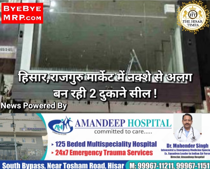 हिसार टाइम्स – हिसार नगर निगम ने मंगलवार को राजगुरु मार्केट में नक्शे के विपरीत बनाई जा रही दो दुकानों को सील कर दिया। निगम की भवन शाखा ने दुकान मालिक को जनवरी में नोटिस थमाया था। इसके बाद भी दुकान मालिक ने निर्माण बंद नहीं किया। राजगुरु मार्केट में दुकान नंबर 169-170 को मिलाकर एक दुकान बनाई जा रही थी। दुकान मालिक ने निगम की भवन शाखा से बेसमेंट,