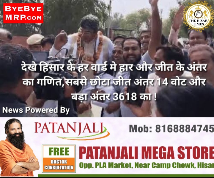 हिसार टाइम्स – हिसार नगर निगम चुनावों में भाजपा ने प्रचंड जीत के साथ अपना परचम लहराया। बुधवार को हुई मतगणना में भाजपा के उम्मीदवार प्रवीण पोपली ने कांग्रेस के कृष्ण टीटू सिंगला को 64 हजार 456 वोटों से हरा दिया भाजपा के प्रवीण पोपली को 96 हजार 396 और कांग्रेस के कृष्ण सिंगला को 31 हजार 873 वोट मिले। मेयर चुनाव में 6 उम्मीदवार थे। जिनमें तीसरे नंबर पर 2971 वोटों के साथ निर्दलीय सुरेंद्र कुमार रहे। चौथे नंबर पर NOTA को 2012 वोट मिले।इसके अलावा निर्दलीय दर्शन को 1892, सुरेंद्र भोरिया को 1665, होशियार सिंह को 1285, गुरप्रीत सिंह को 1848 और मीरा लोट को महज 1892 वोट मिले वहीं वार्ड पार्षदों के चुनाव में भाजपा ने 20 में से 17 वार्डों पर जीत हासिल की। 2 वार्डों में निर्दलीय उम्मीदवार चुनाव जीते जबकि कांग्रेस एक ही वार्ड से पार्षद का चुनाव जीत सकी