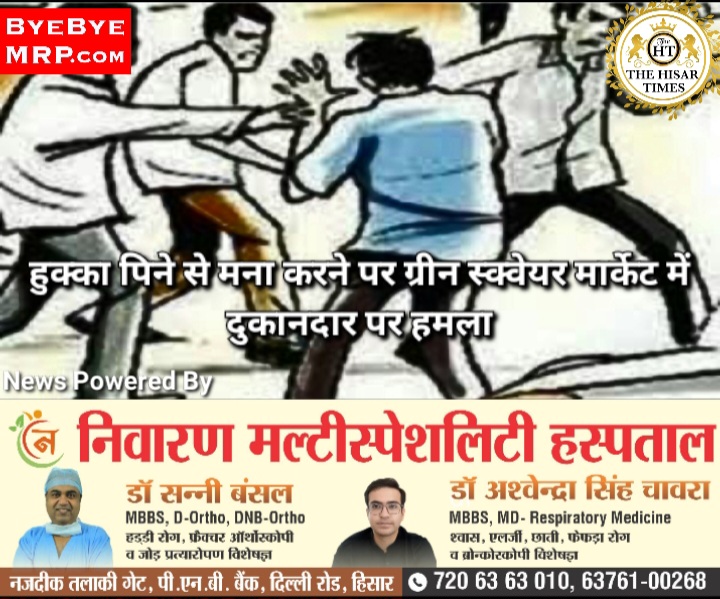 हिसार टाइम्स – हिसार की ग्रीन स्क्वेयर मार्केट में दुकानदार ने कुछ युवकों को दुकान पर हुक्का पीने से मना कर दिया। इस पर युवकों ने दुकान मालिक व उसके दोस्त पर ईंट व तेजधार हथियार से हमला कर दिया। घायलों को उपचार के लिए नागरिक अस्पताल में भर्ती कराया गया है। पुलिस ने शिकायत के आधार पर अज्ञात युवकों के खिलाफ केस दर्ज कर लिया है।पुलिस को दी शिकायत में गांव राजली निवासी अजय सिंह ने बताया कि उसकी ग्रीन स्क्वेयर मार्केट में भाईचारा टी स्टाल के नाम से दुकान है।