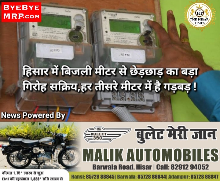 हिसार टाइम्स– हिसार में बिजली निगम ने मीटर टेम्परिंग का बड़ा खुलासा किया है, बिजली निगम अधिकारियों ने बताया कि हिसार के अंदर मीटर टेंपरिंग का नेटवर्क चल रहा है। इससे बिजली निगम को करोड़ों का नुकसान हो रहा है। अकेले हिसार में बिजली निगम को 3822 मीटर में से 1381 मीटर टेंपर मिले हैं। यानी हर तीसरे मीटर में गड़बड़ी मिली है।उपभोक्ता बिजली मीटर में छेड़छाड़ कर बिल को घटा देते हैं। मार्केट में बिजली बिल घटाने का पुर्जा रेजिस्टेंस 10 रुपए में मिलता है। इससे 4 गुना तक बिल आसानी से घटाया जा सकता है।
