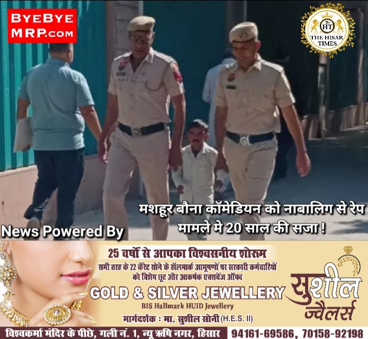 नोट – देश दुनिया की बड़ी खबरें व जॉब रिक्वायरमेंट देखे नीचे.. हिसार टाइम्स – हरियाणा के मशहूर कॉमेडियन बौना कलाकार दर्शन को नाबालिग से रेप के मामले में हिसार में एडीजे सुनील जिंदल की कोर्ट ने 20 साल की सजा सुनाई है। इसके अलावा कोर्ट ने दोषी पर 1 लाख 7 हजार रुपए का … Continue reading मशहूर बौना कॉमेडियन को नाबालिग से रेप मामले मे 20 साल की सजा !