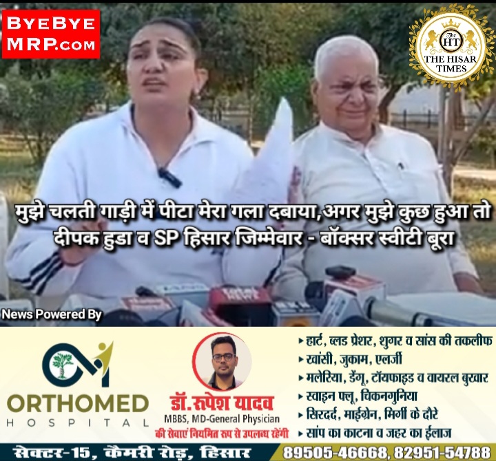 नोट – देश दुनिया की बड़ी खबरें व जॉब रिक्वायरमेंट देखे नीचे.. हिसार टाइम्स – पति दीपक हुड्डा से विवाद के बीच रविवार शाम अंतरराष्ट्रीय बॉक्सर स्वीटी बूरा ने मीडिया से बातचीत में दीपक पर संगीन आरोप लगाने के साथ ही पुलिस को भी कटघरे में खड़ा किया। आपबीती बताते हुए फफक पड़ीं। स्वीटी ने … Continue reading मुझे चलती गाड़ी में पीटा, मेरा गला दबाया,अगर मुझे कुछ हुआ तो दीपक हुडा व SP हिसार जिम्मेवार – बॉक्सर स्वीटी बूरा