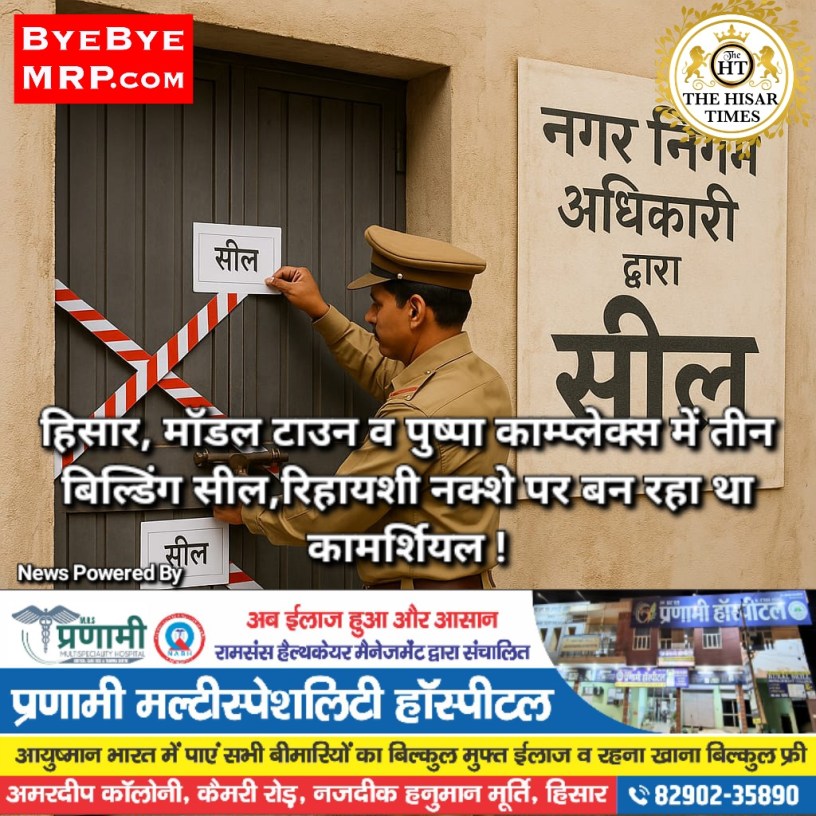 हिसार टाइम्स – हिसार नगर निगम की बिल्डिंग ब्रांच ने शनिवार को शहर की तीन अलग-अलग बिल्डिंग सील की, इनमें एक बिल्डिंग वन डब्लू के साथ वाली है इस बिल्डिंग का निर्माण कमर्शियल आधार पर किया जा रहा था, जबकि नक्शा रिहायशी पास था, निगम ने मालिक को नोटिस दिया था लेकिन इसके बावजूद काम बंद नहीं हुआ, निगम ने इसे सील कर दिया पुष्पा काम्प्लेक्स में दो बिल्डिंग सील की गई,