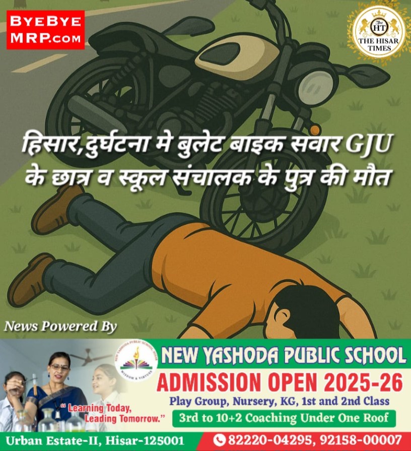 हिसार टाइम्स – हिसार के बगला मोड़ के पास बुधवार दोपहर करीब डेढ़ बजे बुलेट बाइक अनियंत्रित होकर गिरने से जीजेयू के छात्र की मौत हो गई। उकलाना निवासी विनय वर्मा (23) के पिता उकलाना क्षेत्र में निजी स्कूल चलाते हैं।पुलिस को दी शिकायत में परिजनों ने बताया कि विनय बुलेट पर दवा लाने के लिए अग्रोहा के लिए करीब सवा एक बजे चला था। बगला मोड़ के पास पहुंचा तो कार से बचते समय उसका बुलेट अंनियंत्रित होकर गिर गया। इससे विनय गंभीर रूप से घायल हो गया। राहगीरों ने उसे सेक्टर-14 के एक निजी अस्पताल में पहुंचाया, जहां चिकित्सकों ने उसे मृत घोषित कर दिया। जांच अधिकारी का कहना है कि वीरवार को शव का पोस्टमार्टम कराया जाएगा।