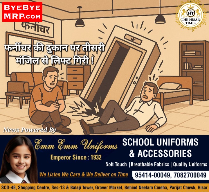 नोट – देश दुनिया की बड़ी खबरें व नौकरी व जॉब से संबंधित सूचनाए नीचे देखें हिसार टाइम्स – बरवाला के बाजार में स्थित फैंसी फर्नीचर की दुकान पर बालक गांव से आए 52 वर्षीय किसान रमेश दुकान पर लगी लिफ्ट से गिरने से घायल हो गए,जानकारी के अनुसार वह दोपहर करीब 3:30 बजे बरवाला … Continue reading फर्नीचर की दुकान पर तीसरी मंजिल से लिफ्ट गिरी !