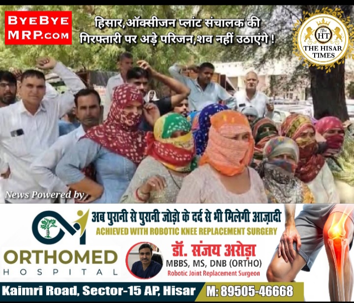 हिसार टाइम्स – हिसार के सेक्टर 27-28 में गुप्ता औद्योगिक गैस प्राइवेट लिमिटेड में ऑक्सीजन सिलिंडर फटने से नियाना गांव निवासी कर्मचारी विजेंद्र (38) की मौत के मामले में सदर थाना पुलिस ने प्लांट संचालक के खिलाफ लापरवाही बरतने का केस दर्ज किया है। वहीं, आरोपी प्लांट संचालक की गिरफ्तारी के लिए परिजनों व ग्रामीणों ने बुधवार को नागरिक अस्पताल में धरना दिया। बाद में सदर थाना परिसर पहुंच कर प्रदर्शन किया। परिजनों ने कहा कि जब तक आरोपी की गिरफ्तारी नहीं हो जाती,