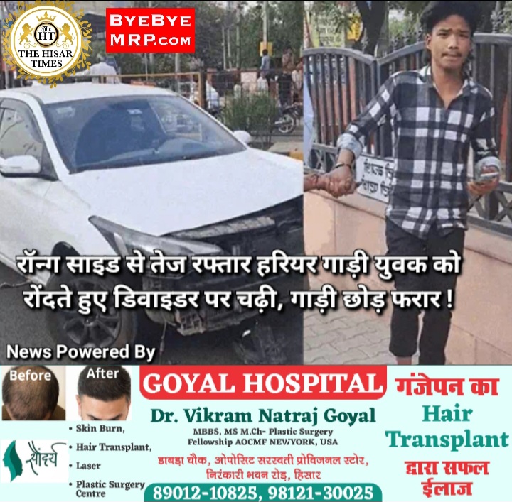 हिसार टाइम्स – हिसार के राजगढ़ रोड पर सेक्टर 15 मार्केट मोड पर दो गाड़ियों की टक्कर हो गई। इस हादसे के बाद रोहतक नंबर की हैरियर गाड़ी सवार युवक भाग गए, वहीं आई 20 कार सवार युवक बाल-बाल बच गया। युवक आजाद नगर का रहने वाला है और वह सेक्टर 15 किसी काम से जा रहा था इसी दौरान रॉन्ग साइड से आई तेज रफ्तार कार ने आई 20 कार को टक्कर मार दी। कार की रफ्तार इतनी तेज थी वह युवक को रौंदते हुए डिवाइडर पर चढ़ गई,