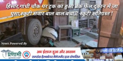 हिसार,गांधी चौक पर ट्रक का हुआ ब्रेक फेल,दुकान में जा घुसा,स्कूटी सवार बाल बाल बचा,2 स्कूटी क्षतिग्रस्त !