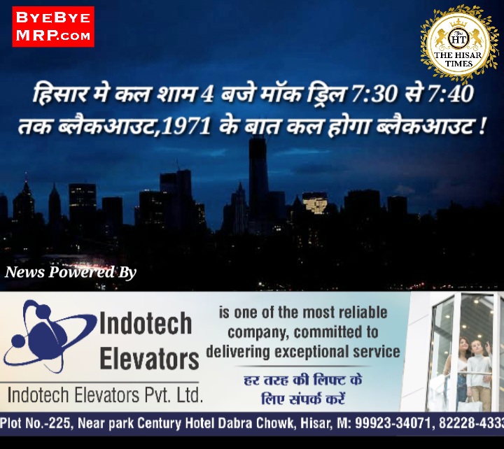 हिसार टाइम्स – हरियाणा के 11 शहरों और पंजाब में 20 जगहों में युद्ध से बचने के लिए कल (7 मई) मॉक ड्रिल होगी। इसके अलावा हिमाचल के शिमला और चंडीगढ़ में भी मॉक ड्रिल रहेगी। इन शहरों में रात में सायरन बजेंगे और ब्लैकआउट भी होगा।मंगलवार को जालंधर में रात 8 बजे से 9 बजे तक ब्लैकआउट रहा। वहीं हिसार और फिरोजपुर में सायरन बजाकर टेस्टिंग की गई। उधर, फरीदाबाद में कल सभी विभागों के अधिकारियों की छुट्टी कैंसिल कर दी गई है। हरियाणा में कल सुबह 10 बजे मुख्य सचिव की ओर से वीडियो कॉन्फ्रेंस भी की जाएगी, जिसमें प्रदेश के सभी DC मौजूद रहेंगे। सिविल डिफेंस की टीमों ने मंगलवार से इस एक्सरसाइज की तैयारियां शुरू कर दी हैं। वहीं, पंजाब के सरहदी इलाकों में रहने वाले लोगों का कहना है कि ऐसी तैयारियां आखिरी बार साल 1971 में देखी गई थीं।