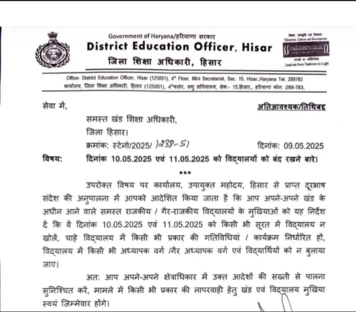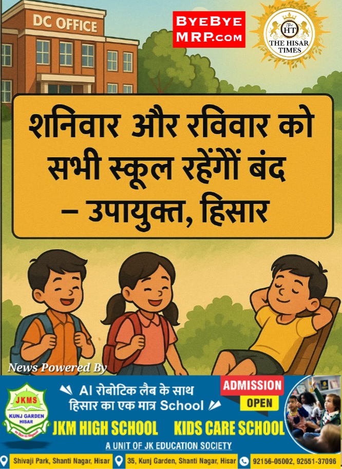 हिसार टाइम्स – हिसार में अगले दो दिन स्कूल बंद रहेंगे हिसार डीसी ने अगले दो दिन शनिवार और रविवार को जिले के सभी स्कूलों को बंद रखने का आदेश दिया है, उन्होंने कहा की लापरवाही बरतने पर सख्त कार्रवाई की जाएगी, जिसके लिए स्कूल प्रशासन जिम्मेदार होगा