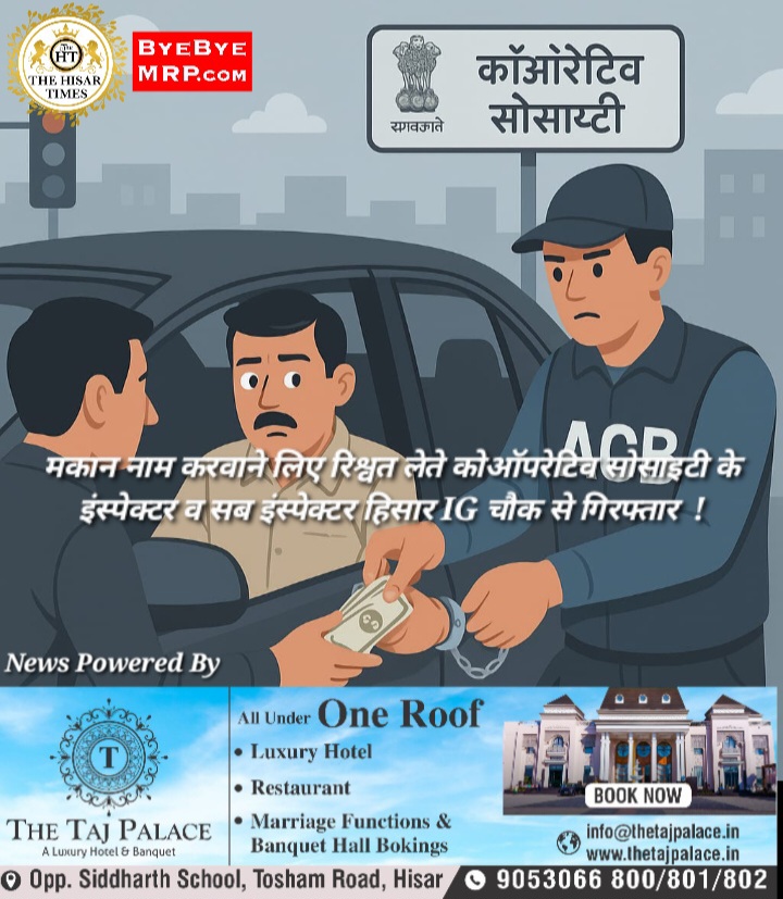 नोट – देश दुनिया की बड़ी खबरें व नौकरी, जॉब से संबंधित सूचनाए नीचे देखें ! हिसार टाइम्स – भ्रष्टाचार निरोधक दस्ता (एसीबी) ने शुक्रवार को हाउसिंग सोसायटी के एक मकान को माता के नाम करने के बदले 30 हजार रुपये की रिश्वत लेते हुए सहकारी समिति के निरीक्षक हरबंस और उप निरीक्षक सोनू को … Continue reading मकान नाम करवाने लिए रिश्वत लेते कोऑपरेटिव सोसाइटी के इंस्पेक्टर व सब इंस्पेक्टर हिसार IG चौक से गिरफ्तार !
