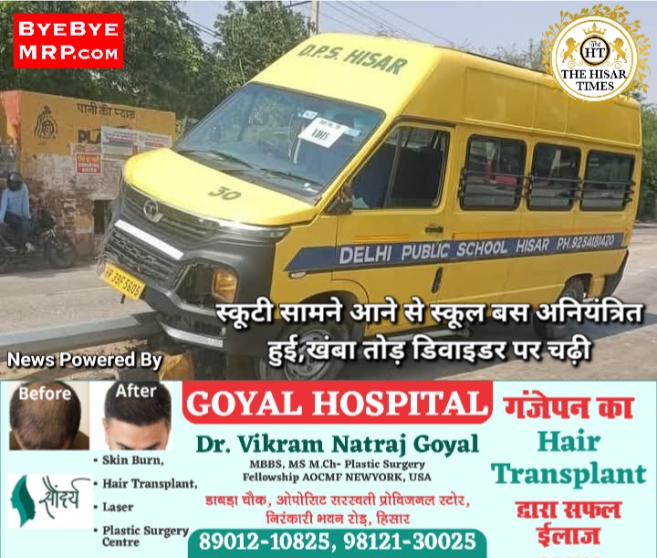 हिसार टाइम्स – हिसार के मिलगेट रोड पर जिंदल पार्क के समीप शुक्रवार दोपहर बाद दिल्ली पब्लिक स्कूल की बस अनियंत्रित होकर खंभे को तोड़ते हुए डिवाइडर पर चढ़ गई। स्कूल बस में सवार चालक-परिचालक सहित तीन शिक्षक मौजूद थे। स्कूल बस का हादसा देखकर आसपास के लोग मौके पर दौड़े। गनीमत रही कि बस में विद्यार्थी नहीं थे।जानकारी के मुताबिक