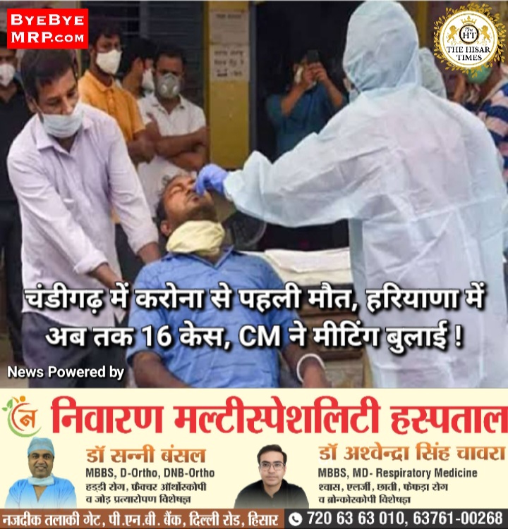 हिसार टाइम्स – देश में बढ़ते करोना के केसो के बीच चंडीगढ़ में बुधवार को करोना से एक व्यक्ति की मौत हो गई उसका सेक्टर 32 स्थित गवर्नमेंट मेडिकल कॉलेज में इलाज चल रहा था, 3 दिन से उसे सांस लेने में तकलीफ थी मृतक के पहचान उत्तर प्रदेश के फिरोजाबाद के रहने वाले राजकुमार उम्र 40 के रूप में हुई है, फिलहाल व लुधियाना में रह रहा था उधर हरियाणा में कोरोना के 16 केस आ चुके हैं, एक्टिव केस की संख्या 13 है,