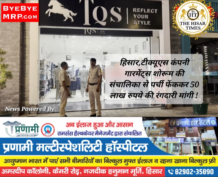 पुलिस के अनसार गारमेंट्स शोरूम हिसार के न्यू मॉडल टाउन निवासी अंजू का है। उनकी बहन मंजू शोरूम संभालती है। वीरवार रात एक युवक शोरूम के अंदर जाकर पर्ची डालकर चला जाता है। पर्ची पर गोलू भीम नगरिया लिखा है। नाम के नीचे लिखा गया है कि 50 लाख रुपये सुबह दस बजे तक पहुंचा दे और इसे मजाक मत समझना। नहीं तो सुबह 10 बजे बजे के बाद आपको पता चल ही जाएगा। सदर थाने के एसएचओ रमेश कुमार ने बताया कि शोरूम संचालिका से पर्ची फेंककर रंगदारी का मामला सामने आया है। सीआईए व स्पेशल स्टॉफ टीम आरोपियों की तलाश में जुटी हैं। सीसीटीवी कैमरे की फुटेज खंगाली जा रही हैं। जल्द ही आरोपियों को पकड़ लिया जाएगा।