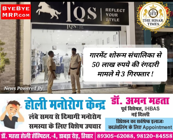 हिसार टाइम्स – हिसार हांसी हाईवे स्थित ग्रीन वैली में टीक्यूएस शोरूम संचालिका से 50 लाख रुपये की रंगदारी मांगने के मामले में पुलिस ने शुक्रवार को तीन युवकों को गिरफ्तार किया है। पूछताछ में तीनों ने बताया कि वीरवार को दिनभर शराब पी। रात को शराब के नशे में रंगदारी मांगी। वहीं, पुलिस ने एक नामजद सहित दो के खिलाफ मामला दर्ज कर लिया है।
