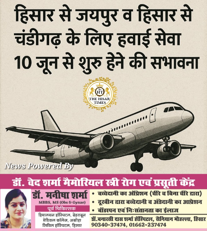 हिसार टाइम्स – जून के माह से हिसार एयरपोर्ट से जयपुर व चंडीगढ़ के लिए हवाई सेवा शुरू होने की संभावना है। 10 जून से इन शहरों के लिए हवाई सेवा शुरू हो सकती है। इन दोनों शहरों के लिए सप्ताह में दो दिन हवाई सेवा उपलब्ध रहेगी।