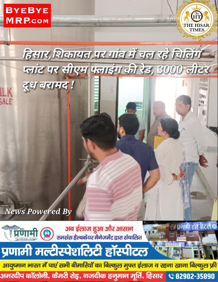 हिसार टाइम्स – हिसार जिले के बालसमन्द गांव में सोमवार को सीएम फ्लाइंग टीम ने गणपति चिलिंग सेंटर पर छापेमारी कर दूध में मिलावट की आशंका के चलते बड़ा कदम उठाया। इस कार्रवाई में टीम ने मौके से करीब 3000 लीटर दूध बरामद किया, जिसके सैंपल लेकर उन्हें जांच के लिए प्रयोगशाला भेजा गया है। यह छापेमारी सीएम फ्लाइंग इंचार्ज सुनैना के नेतृत्व में की गई, जिनके साथ एसआई जितेंद्र, एएसआई सुरेंद्र, एचसी विजय और खाद्य सुरक्षा अधिकारी डॉक्टर पवन चहल मौजूद रहे।