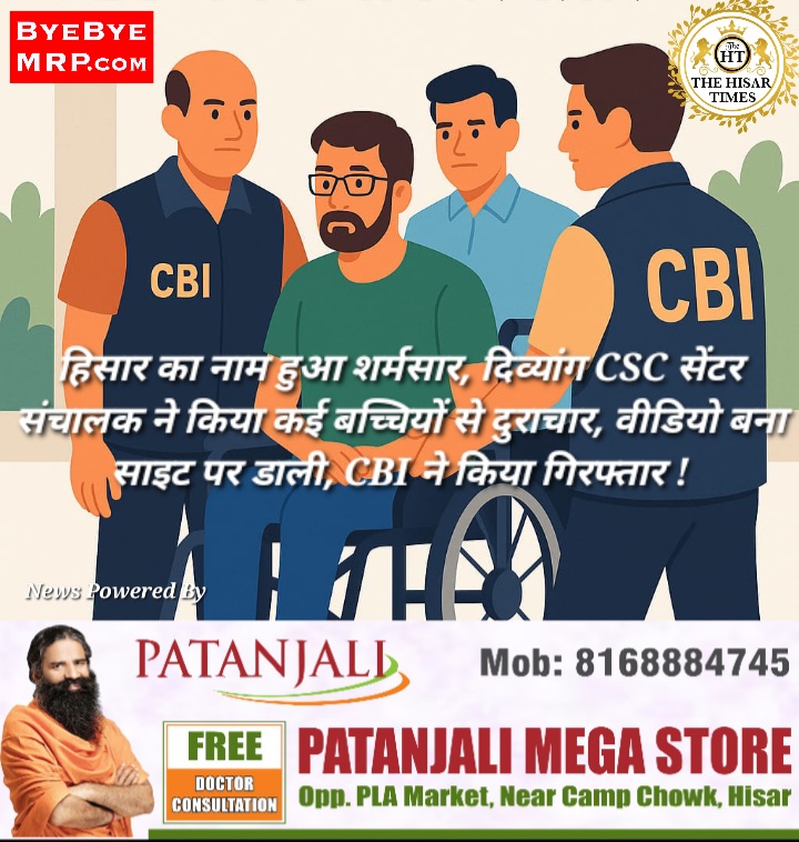 हिसार टाइम्स – हिसार को शर्मसार कर देने वाला बड़ा मामला सामने आया है,हिसार जिले में CBI ने मासूम बच्चियों से दुराचार और उनकी वीडियो बनाकर पोर्न साइट्स पर डालने के आरोप में एक दिव्यांग CSC सेंटर संचालक को काबू किया है। आरोपी वर्षों से यह गंदा काम कर रहा था, लेकिन इसकी भनक तक आसपास के लोगों को नहीं थी। वह छोटी बच्चियों को टॉफी व चॉकलेट का लालच देकर बुलाता और उनका यौन शोषण करता। इसकी वीडियो बनाकर उन्हें दोबारा ब्लैकमेल करता। CBI की टीम ने यह कार्रवाई गुप्त रूप से किए गए एक लंबे ऑपरेशन के बाद की, जिसमें आरोपी की डिजिटल गतिविधियों, मेल आईडी, सोशल मीडिया और डिवाइसेज़ की बारीकी से जांच की गई। गिरफ्तार व्यक्ति की पहचान सोमनाथ (उम्र 40) के रूप में हुई है, जो हिसार के हांसी क्षेत्र के गढ़ी अजीमा गांव का रहने वाला है।