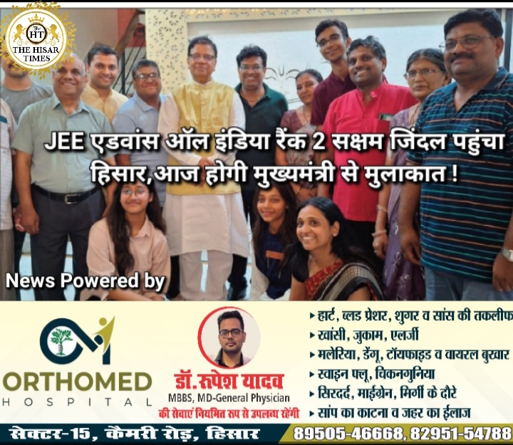 हिसार टाइम्स – जेईई एडवांस का परिणाम जारी होने के बाद सक्षम जिंदल पहली बार अपने घर आया। उसके घर आते ही उसे बधाई देते वालों का तांता लग गया है। पूर्व कैबिनेट मंत्री डॉ. कमल गुप्ता भी समक्ष को बधाई देने उसके घर पहुंचे। डॉ. कमल गुप्ता ने कहा कि सक्षम का जिले व प्रदेश का नाम रोशन किया है। वह सोमवार को एयरपोर्ट पर मुख्यमंत्री नायब सिंह सैनी से उसकी मुलाकात करवाएंगे और उसे सम्मानित भी करवाएंगे। बता दें कि जेईई एडवांस में शहर के सेक्टर 14 निवासी सक्षम जिंदल ने ऑल इंडिया लेवल पर दूसरी रैंकिंग हासिल की है। 2 साल से सक्षम कोटा रहकर परीक्षा की तैयारी कर रहा था और 2 साल से घर भी नहीं आया था।
