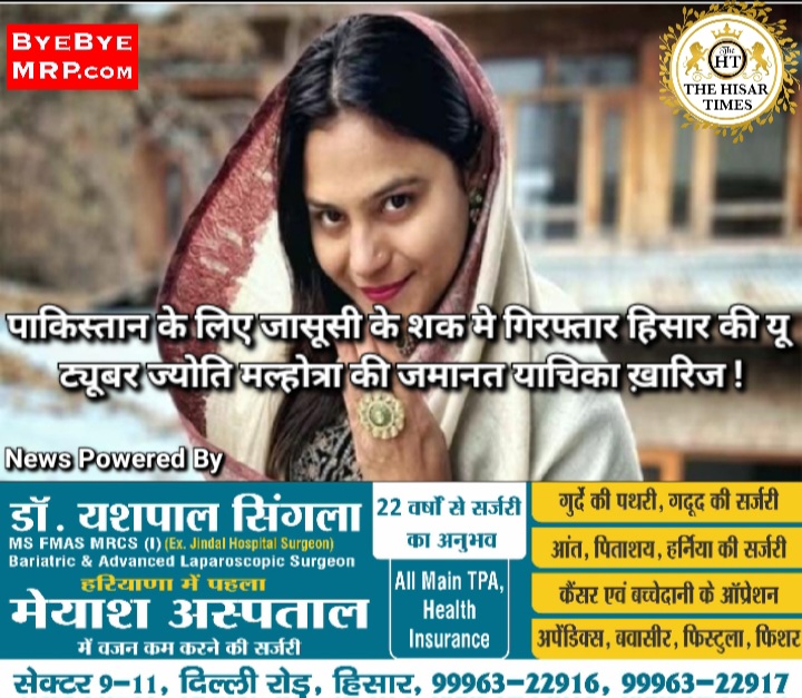 हिसार टाइम्स – हिसार की लेडी यू ट्यूबर ज्योति मल्होत्रा जो की पाकिस्तान के लिए जासूसी के शक में गिरफ्तार है की जमानत याचिका पर अदालत में सुनवाई हुई। दोनों पक्षों के वकीलों के बीच करीब 20 मिनट तक बहस हुई। दोनों पक्षों की बहस सुनने के बाद न्यायिक दंडाधिकारी (प्रथम श्रेणी) सुनील कुमार ने ज्योति मल्होत्रा की जमानत याचिका खारिज कर दी है।