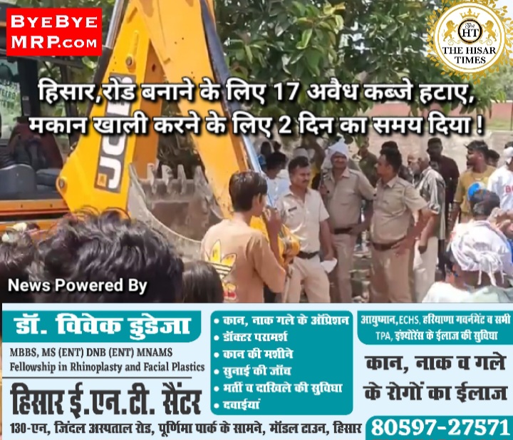 हिसार टाइम्स – हिसार डाबड़ा माइनर पर रोड बनाने के लिए पहले दिन सिंचाई विभाग ने अपनी जमीन से करीब 17 अवैध कब्जे हटाए। इस दौरान जेल के पीछे बसी बस्ती के लोगों को मकान खाली करने के लिए दो दिन का समय दिया गया। वहीं सेक्टर 16-17 के निवासियों ने खुद ही एक-दो दिन में कब्जे हटाने की बात कही। मौके पर भारी पुलिस बल तैनात रहा।