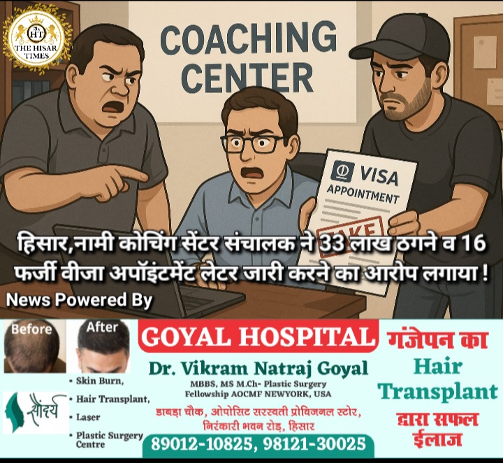 हिसार टाइम्स – हिसार सेक्टर-15 स्थित करियर कम्पास कोचिंग सेंटर के संचालक दिनेश नागपाल ने दो व्यक्तियों पर 33,66,980 रुपये की ठगी, धोखाधड़ी, विश्वासघात व मानहानि का आरोप लगाते हुए एसपी हिसार को शिकायत दी है। एसपी ने शिकायत सिविल थाना को भेजी दी। थाना पुलिस ने मामले की जांच के बाद दो नामजद के … Continue reading हिसार,नामी कोचिंग सेंटर संचालक ने 33 लाख ठगने व 16 फर्जी वीजा अपॉइंटमेंट लेटर जारी करने का आरोप लगाया !