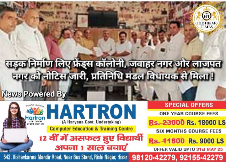हिसार टाइम्स – डाबड़ा माइनर पर प्रस्तावित सड़क के निर्माण के संबंध में फ्रेंड्स कॉलोनी, जवाहर नगर और लाजपत नगर वासियों को नोटिस जारी करने के बाद क्षेत्रवासियों का एक प्रतिनिधिमंडल शुक्रवार को विधायक रणधीर पनिहार से मिला। इस अवसर पर क्षेत्रवासियों ने उन्हें पूरी घटना से अवगत करवाते हुए मुख्यमंत्री के नाम ज्ञापन भी … Continue reading सड़क निर्माण लिए फ्रेंड्स कॉलोनी, जवाहर नगर और लाजपत नगर को नोटिस जारी, प्रतिनिधि मंडल विधायक से मिला !