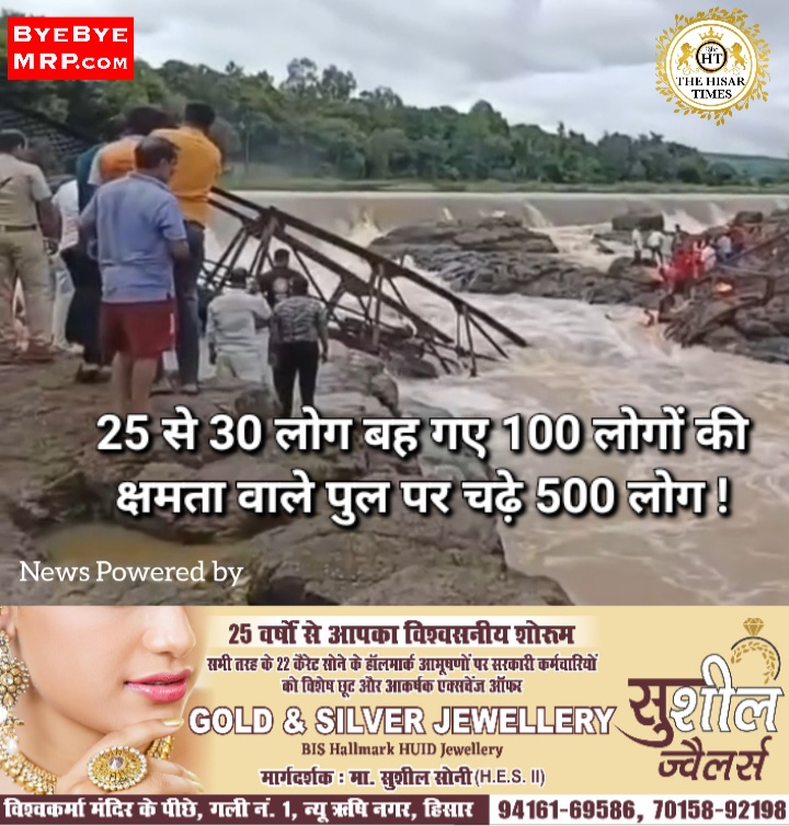 हिसार टाइम्स – महाराष्ट्र में रविवार को पुणे जिले में इंद्रायणी नदी पर बना पुल ढह गया है। जिसमे 25-30 पर्यटकों के बहने की आशंका है। इनमें कई छोटे बच्चे भी हैं।स्थानीय विधायक सुनील शेलके ने बताया कि अब तक 4 लोगों की मौत हो चुकी है। जिनके शव भी बरामद कर लिए गए हैं।