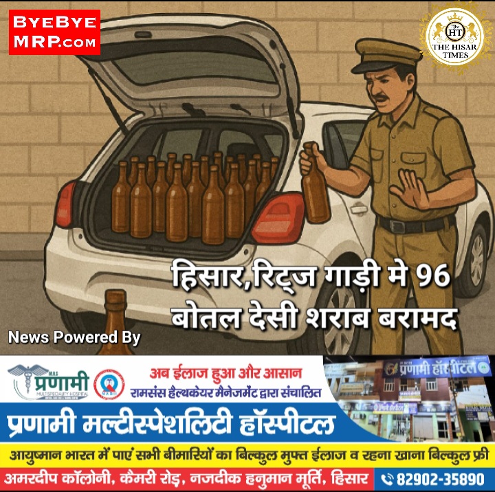 हिसार टाइम्स – हिसार पुलिस की स्पेशल स्टाफ टीम ने गांव धांसू में रिट्ज कार से 96 बोतल देसी शराब बरामद की है। मुख्य सिपाही विक्रांत व टीम को गश्त के दौरान गांव धांसू स्थित गोशाला के पास शराब से भरी एक संदिग्ध कार खड़ी होने की सूचना प्राप्त हुई। पुलिस टीम तुरंत मौके पर पहुंची और एक रिट्ज गाड़ी को खड़ा पाया। नियमानुसार तलाशी लेने पर कार से 8 बॉक्स में भरी हुई 96 बोतल देसी शराब बरामद की गई। पुलिस ने गाड़ी व शराब को कब्जे में लेकर अज्ञात व्यक्ति के विरुद्ध थाना सदर हिसार में हरियाणा आबकारी अधिनियम के तहत अभियोग दर्ज कर लिया है।