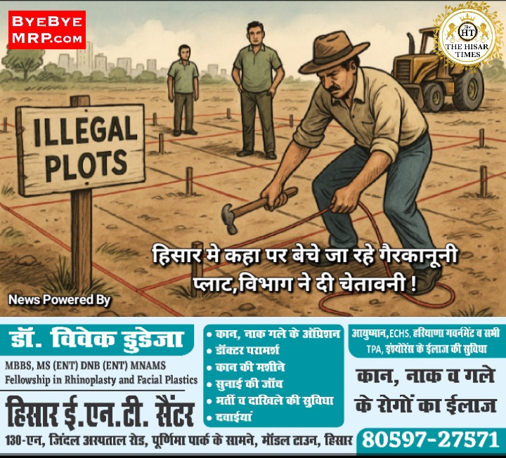 हिसार टाइम्स – जिला नगर योजनाकार कार्यालय हिसार द्वारा आमजन को सतर्क करते हुए सूचित किया गया है कि मिर्जापुर रोड पर स्थित राजस्व संपदा मिर्जापुर की लगभग 32 एकड़ भूमि पर कुछ लोगों द्वारा अवैध रूप से कॉलोनी काटी जा रही है तथा प्लॉट बेचे जा रहे हैं। इस भूमि पर तैयार किए गए ले-आउट प्लान को रेरा अप्रूव्ड बताकर लोगों को भ्रमित किया जा रहा है, जबकि वास्तविकता में यह कॉलोनी पूरी तरह से अवैध है।