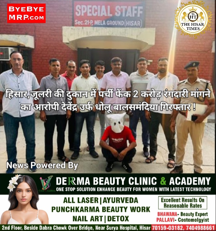 नोट – हिसार जिले में नौकरी संबंधित सूचनाओं, मुख्य समाचारों के लिए नीचे कॉलम पढ़े ! हिसार टाइम्स – हिसार के खजांचियान बाजार स्थित जूलरी की एक दुकान में पर्ची फेंक कर 2 करोड़ की रंगदारी मांगने के आरोपी देवेंद्र उर्फ धोलू बालसमंदिया को पुलिस ने शनिवार को गिरफ्तार कर लिया। प्रारंभिक जांच में पता … Continue reading हिसार,जूलरी की दुकान में पर्ची फेंक 2 करोड़ रंगदारी मांगने का आरोपी देवेंद्र उर्फ धोलू बालसमंदिया गिरफ्तार !