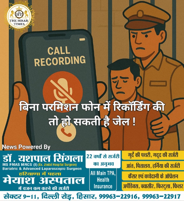 हिसार टाइम्स – अगर आप किसी से बात कर रहे हैं. और इस दौरान आप उस बातचीत को बिना सामने वाले व्यक्ति की परमिशन के बिना उससे पूछे रिकाॅर्ड करते हैं. तो आप अपने लिए मुश्किल खड़ी कर सकते हैं भारतीय कानून के मुताबिक अगर आप किसी की बातचीत को बिना उसकी सहमति के रिकॉर्ड करते हैं. तो ये उसके राइट टू प्राइवेसी का वॉयलेशन माना जाता है.