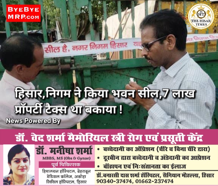 हिसार टाइम्स – हिसार नगर निगम की टैक्स ब्रांच की टीम ने मंगलवार को विकास नगर में एक भवन को सील कर दिया। सचिव संजय शर्मा व सचिव राहुल सैनी ने बताया कि इस भवन का अब तक सात लाख रुपये प्रॉपर्टी टैक्स बकाया था। इसको लेकर भवन स्वामी को नोटिस भी जारी किया गया था। नोटिस के बाद भी भवन मालिक ने टैक्स नहीं भरा।