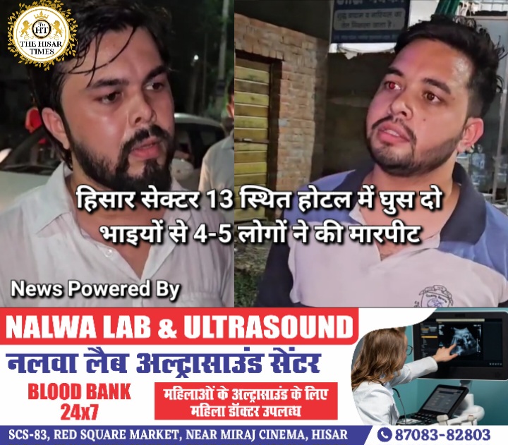 हिसार टाइम्स – सेक्टर 13 स्थित पार्किंग में एक होटल में घुसकर कुछ लोगों ने दो भाइयों से जमकर मारपीट की भाइयों का आरोप है, कि हमलावर उनके गले से सोने की चैन भी तोड़ कर ले गए अचानक हुए इस हमले में आसपास के इलाके में सनसनी फैल गई, पुलिस के पहुंचने से पहले हमलावर युवक भाग खड़े हुए, पुलिस ने कुछ लोगों को पूछताछ के लिए हिरासत में लिया है