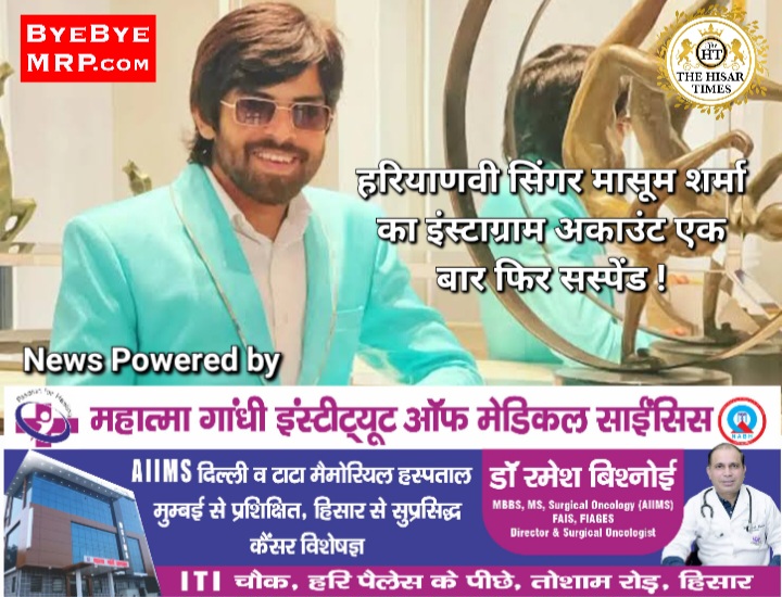 हिसार टाइम्स – डेढ़ महीने के अंदर ही हरियाणवी सिंगर मासूम शर्मा का इंस्टाग्राम अकाउंट एक बार फिर सस्पेंड कर दिया गया है। डेढ़ महीने के अंदर ये दूसरी बार है जब उनका अकाउंट अचानक सस्पेंड किया गया। इससे पहले 12 मई को भी उनका 7.61 लाख फॉलोअर्स वाला इंस्टाग्राम अकाउंट बंद कर दिया गया था।पहला अकाउंट बंद होने के बाद मासूम ने हाल ही में ‘टीम मासूम शर्मा’ के नाम से नया पेज बनाया था, जिस पर 80 हजार से ज्यादा फॉलोअर्स हो चुके थे,