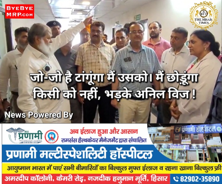 हिसार टाइम्स – गुरुवार को मंत्री अनिल विज अपने पैर के अंगूठे का एक्सरे और सीटी स्कैन करवाने अंबाला कैंट के नागरिक अस्पताल में पहुंचे। यहां खामियां देकर विज अधिकारियों पर भड़क गए। उन्होंने कहा खामियों की जांच करवाऊंगा और दोषियों को बख्शा नहीं जाएगा।विज ने कहा जो-जो है टांगूंगा मैं उसको। मैं छोड़ूंगा किसी को नहीं। उन्होंने अस्पताल की मेडिकल ऑफिसर डॉ. पूजा पेंटल सहित प्रबंधन को चेतावनी दी। मैंने जी जान लगाई, लेकिन सब बर्बाद कर दिया मंगलवार दोपहर ढाई बजे करीब अनिल विज अचानक अंबाला कैंट के सिविल अस्पताल पहुंचे।