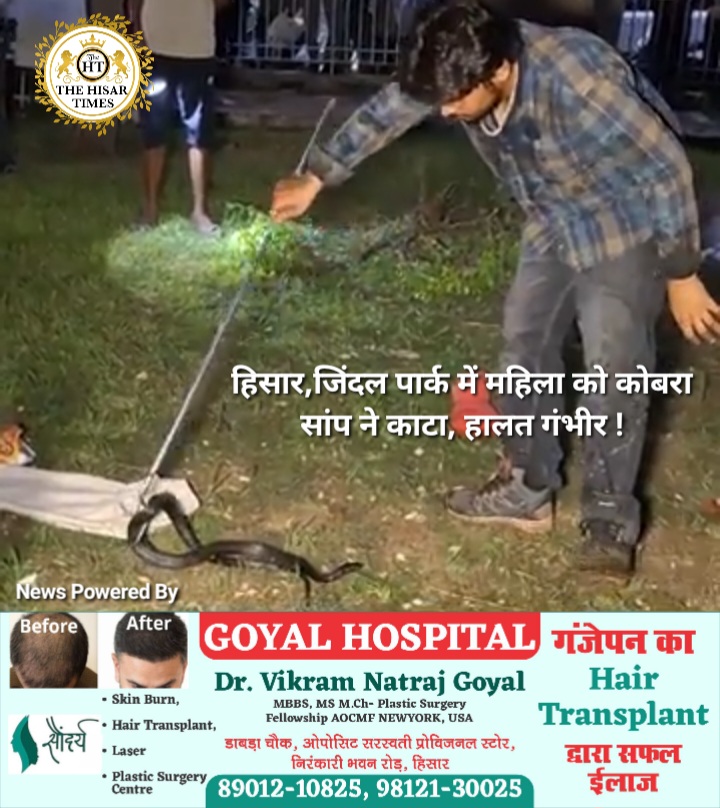 हिसार,जिंदल पार्क में महिला को कोबरा सांप ने काटा, हालत गंभीर !