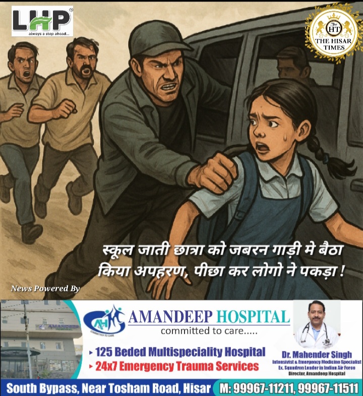 हिसार टाइम्स – सोमवार सुबह 15 वर्षीय स्कूली छात्रा के अपहरण का प्रयास किया गया पीड़िता के पिता द्वारा दी गई शिकायत के अनुसार, सोमवार सुबह करीब 8 बजे उनकी बेटी रोजाना की तरह स्कूल जा रही थी। रास्ते में पहले से घात लगाए बैठे तीन युवकों — मोनू, अशोक और गोविंदा, जो कि खरक पूनिया गांव के निवासी हैं — ने किशोरी को जबरन कार में बिठा लिया। घटना को ग्रामीणों ने देख लिया और उन्होंने तुरंत सतर्कता दिखाते हुए कार का पीछा किया और कुछ ही दूरी पर तीनों आरोपियों को पकड़ लिया। ग्रामीणों ने किशोरी को सुरक्षित छुड़वाया और तुरंत पुलिस को सूचना दी।