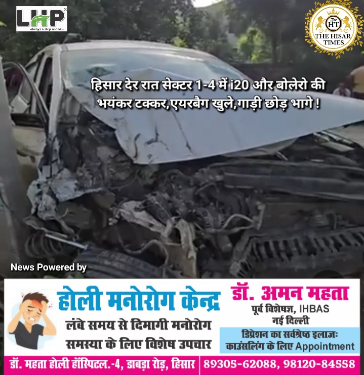 हिसार देर रात सेक्टर 1-4 में i20 और बोलेरो की भयंकर टक्कर,एयरबैग खुले,गाड़ी छोड़ भागे !