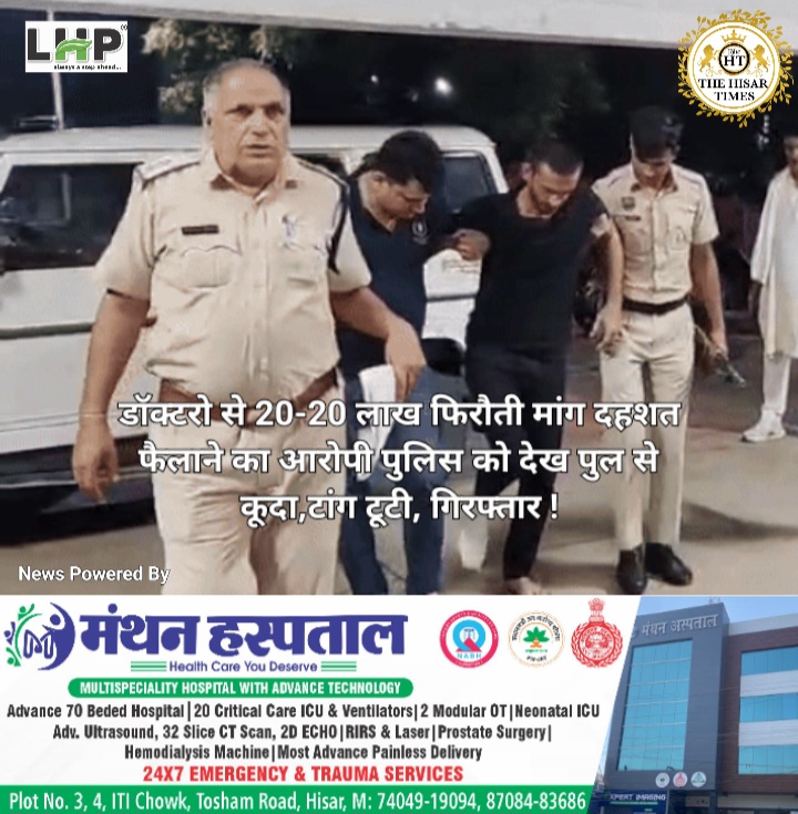 नोट – नीचे कॉलम में देखें > हिसार टाइम्स जॉब्स क्लासिफाइड > आज की बड़ी खबरें फटाफट ! ————————————————————————– हिसार टाइम्स – शहर के चिकित्सकों को फोन कर 20-20 लाख की फिरौती मांगने और न देने पर जान से मारने की धमकी देने के आरोपी थुआ निवासी अंकित को पुलिस ने गिरफ्तार कर लिया है। … Continue reading डॉक्टरो से 20-20 लाख फिरौती मांग दहशत फैलाने का आरोपी पुलिस को देख पुल से कूदा,टांग टूटी, गिरफ्तार !