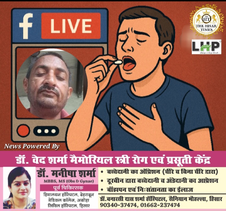 नोट – नीचे कॉलम में देखें > हिसार टाइम्स जॉब्स क्लासिफाइड > आज की बड़ी खबरें फटाफट ! ————————————————————————– हिसार टाइम्स – हिसार के नारनौंद के वार्ड नंबर 10 में रहने वाले नीरज कुमार (45) सोमवार सुबह फेसबुक पर लाइव आया। इसी दौरान उसने जहरीला पदार्थ निगलकर आत्महत्या कर ली। यह वीडियो सोमवार शाम सोशल … Continue reading फेसबुक पर लाइव आकर जहर निगल दी जान !