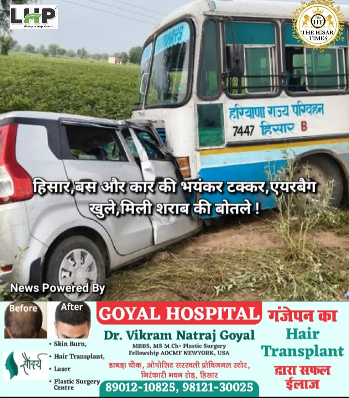 बस राजस्थान के हनुमानगढ़ जिले के भादरा से हिसार आ रही थी। हादसे में कार सवार तीन दोस्त घायल हुए, जिनमें ड्राइवर की हालत गंभीर है। घायलों को एंबुलेंस से हिसार के निजी अस्पताल में भर्ती कराया गया। बस ड्राइवर जोगिंद्र सिंह के अनुसार, वे गोगामेड़ी मेले के लिए चल रही स्पेशल बस चला रहे थे, तभी सामने से आ रही वैगनआर का संतुलन बिगड़ा और वह बस से टकरा गई। कार में सवार लोग नशे में प्रतीत हो रहे थे। तलाशी में तीन शराब की बोतलें (दो खाली, एक भरी) बरामद हुईं। कार से एक मोबाइल फोन और लैपटॉप भी मिला, जिसे पुलिस ने कब्जे में ले लिया है। पुलिस ने कार में मिले फोन से घायलों के परिजनों को सूचना दी। राजस्थान पुलिस हादसे के कारणों की जांच कर रही है।