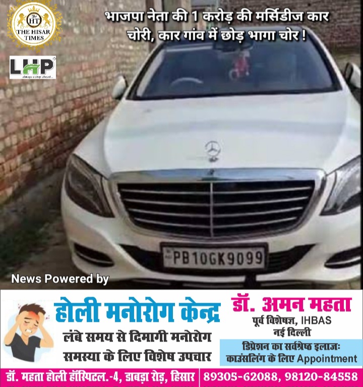 हिसार टाइम्स – हिसार के उकलाना क्षेत्र के गांव लितानी में शुक्रवार दोपहर एक चोर मर्सिडीज कार को गली में छोड़कर चला गया। करीब एक करोड़ से अधिक कीमत की गाड़ी को देख कर लोगों ने पुलिस को सूचना दी। इसके बाद पुलिस ने गाड़ी के नंबरों से मालिक की पहचान की। गाड़ी पंचकूला के भाजपा नेता श्याम लाल बंसल की बताई जा रही है। दोपहर को पुलिस क्रेन की मदद से पंचकूला टीम ले गई।
